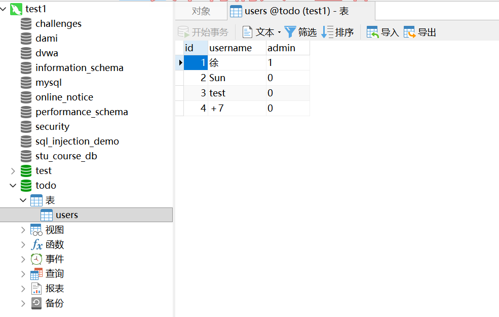 - 进入navicat,新建数据库,新建表,插入敏感数据