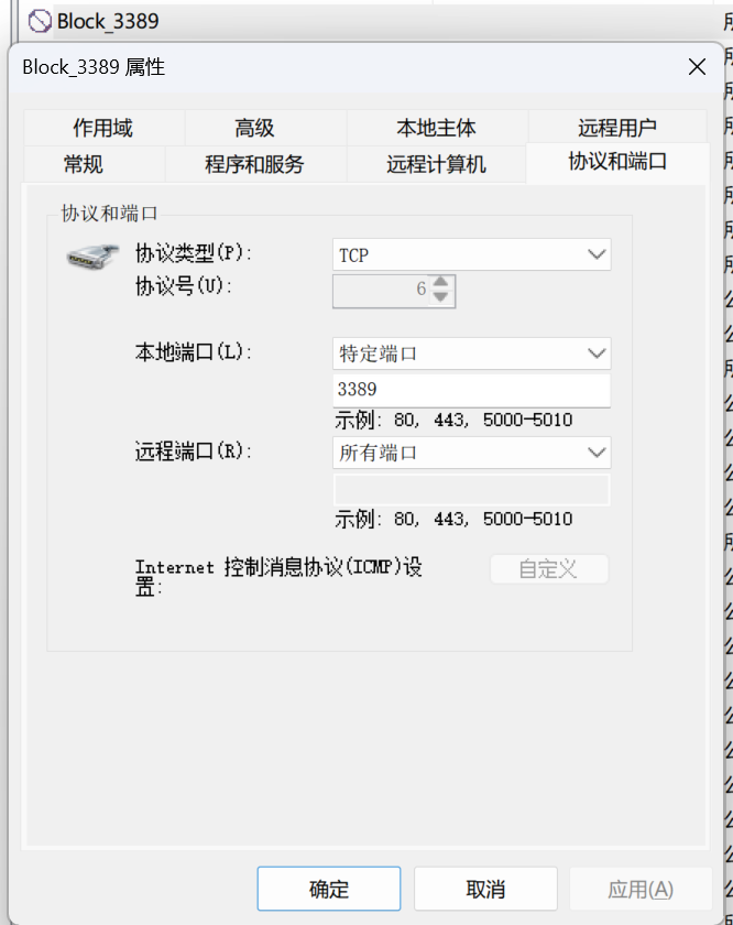 - 协议和端口:TCP 特定端口 3389