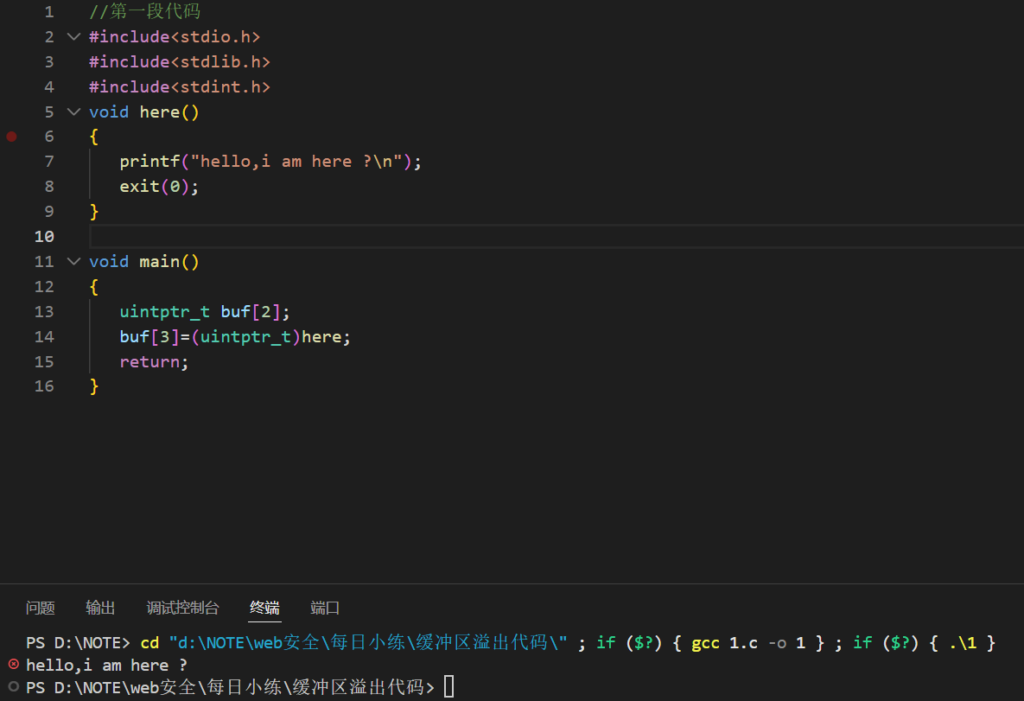 原代码定义了一个here函数,用于输出hello,i am here ?,后退出程序,主函数定义了一个无符号整数类型的数组buf,但是出现了一个非法的操作