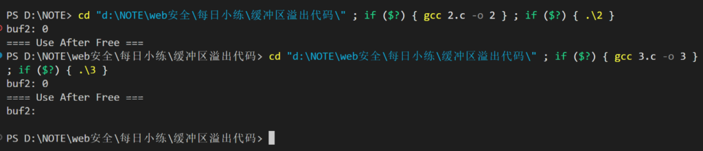 第二段代码在释放 buf1 后将指针置为 NULL,再次使用该指针会导致对空指针的非法访问,错误容易被发现;第三段代码释放 buf1 后未将指针清空,形成悬空指针,当后续 malloc 复用同一内存区域时,通过已释放指针写入的数据会影响新的对象,属于典型的 Use-After-Free 漏洞,错误更加隐蔽且危险。